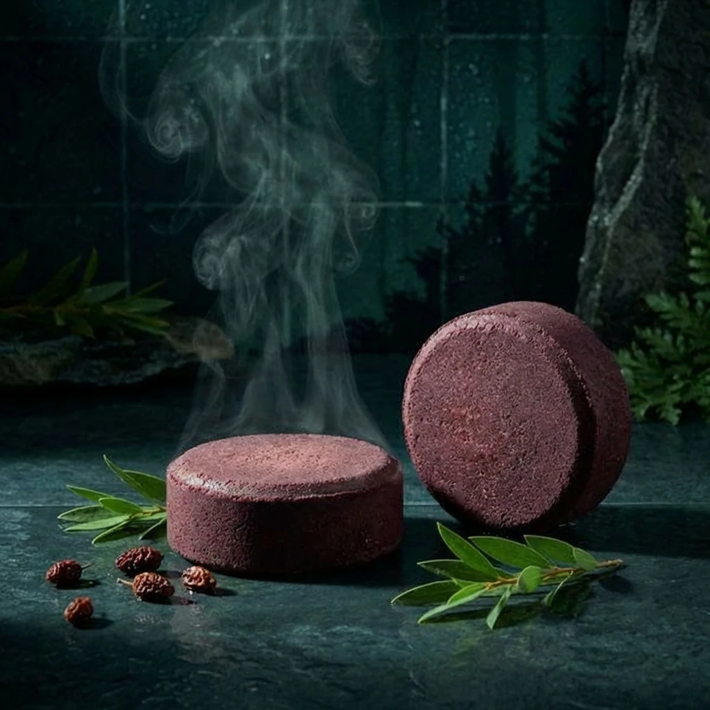 Thicket is the first in our Farm Botanical Steamer line. Each puck is pressed with sumac berry powder (Rhus coriaria), rich in gallic acid and ellagitannins, alongside cedarwood, eucalyptus, and peppermint essential oils.