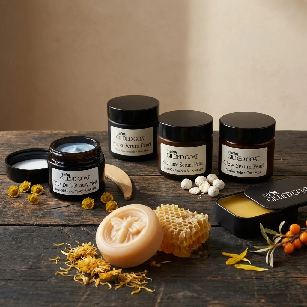 Goat milk is rich in fats that actually stay put, and its pH sits close to your skin's, so instead of stripping and stinging, it softens. That's why a goat-milk bath feels different from the first second,and why a goat-milk serum pearl leaves your face feeling like it just drank something. Farm families have used it on cracked heels, rough hands, and tired skin for generations, long before lab reports caught up.